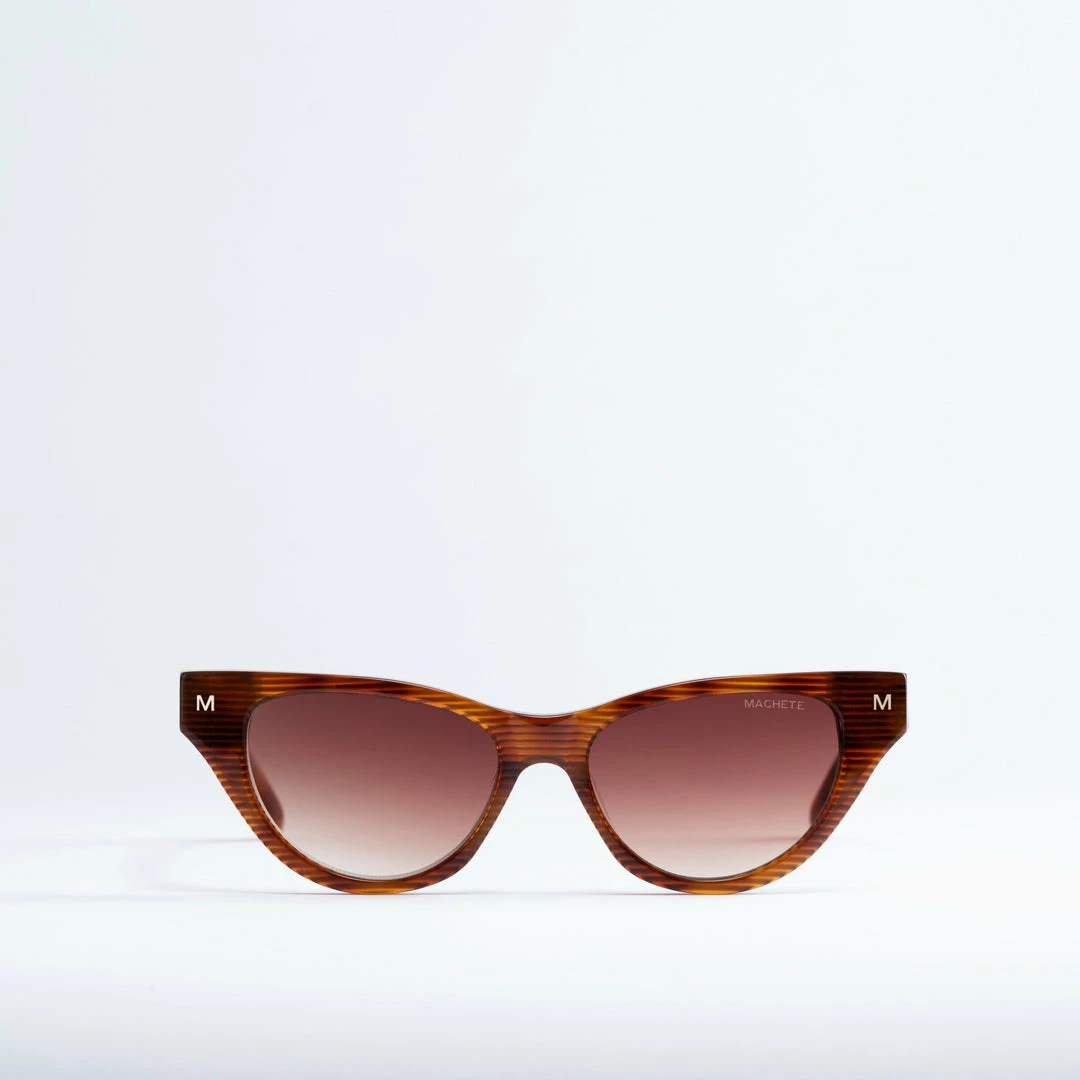 Take any ensemble to the next level with Suzy, our ultra-sleek narrow cat-eye frame. Handcrafted from the most environmentally friendly and highest-quality acetate on the market today to ensure your frames will not only last but be kind to the planet as well. Adorned with a gold Machete logo and hardware as well as a ring for your eyeglass chain at the temples.