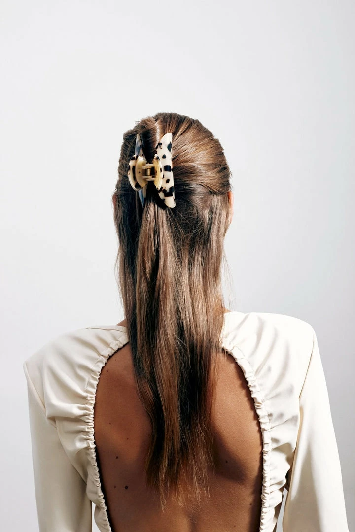The model wears our Grande Heirloom Claw in Blonde Tortoise.