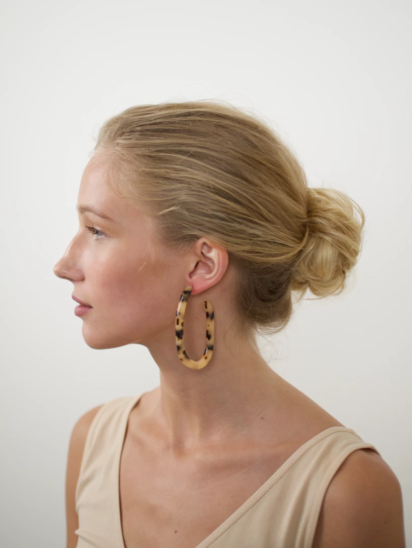 The model wears our Margot X Hoops in Blonde Tortoise.