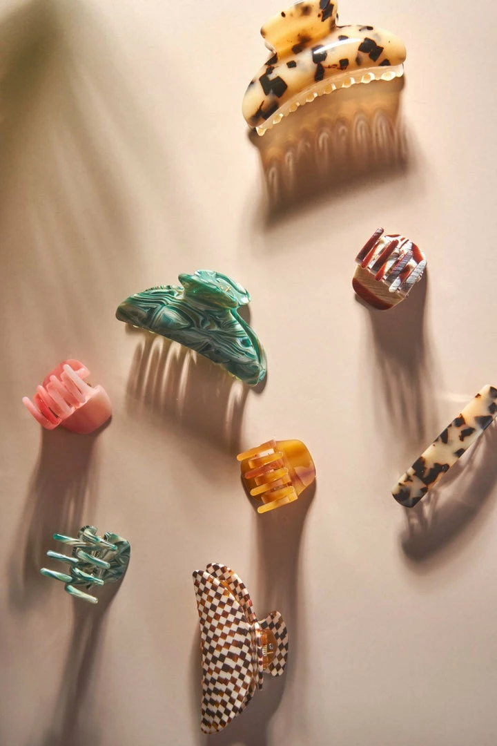 The model wears our Midi Heirloom Claw in Stromanthe.