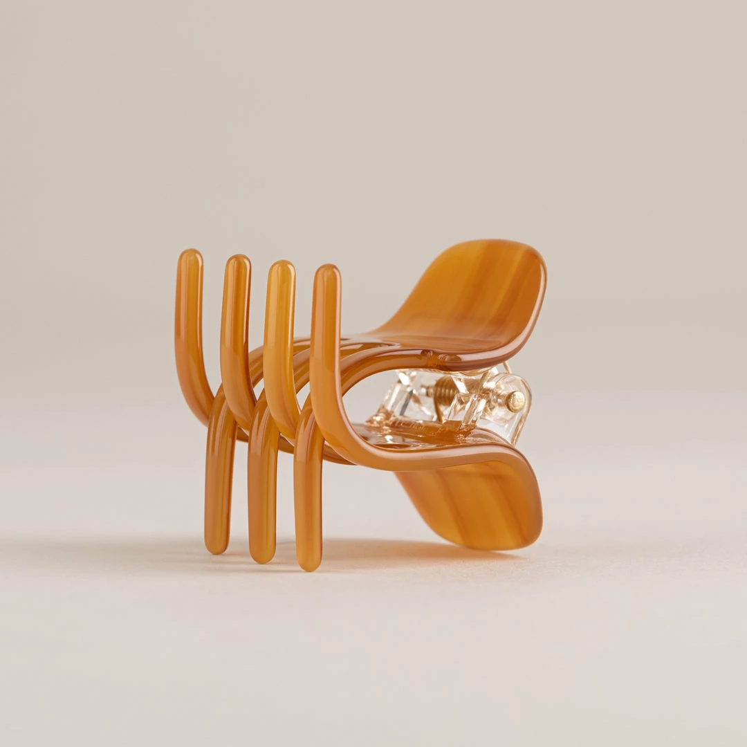 The model wears 2 of our Mini Claws in Canyon Brown.