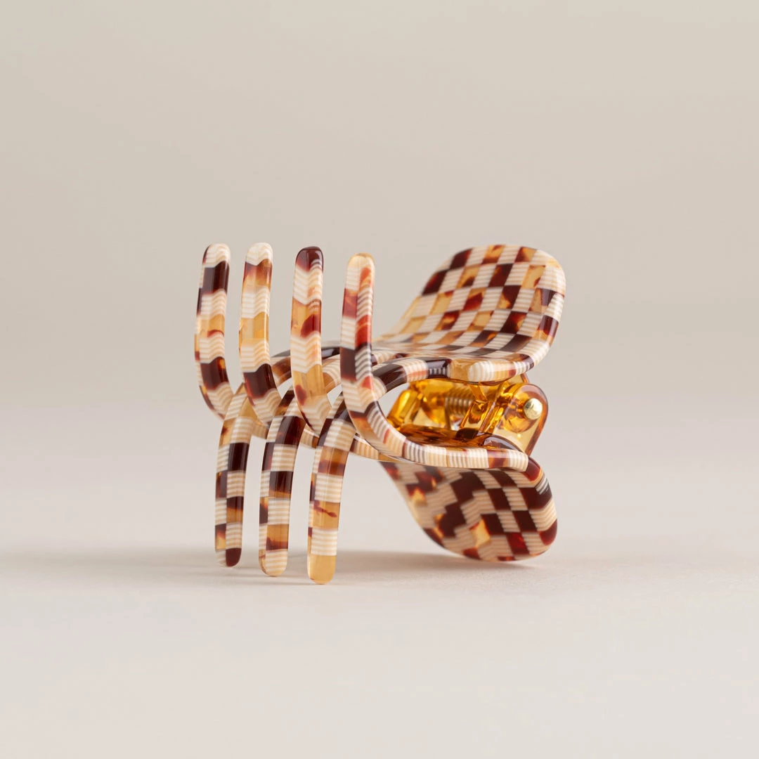 The model wears 2 of our Mini Claws in Canyon Brown.