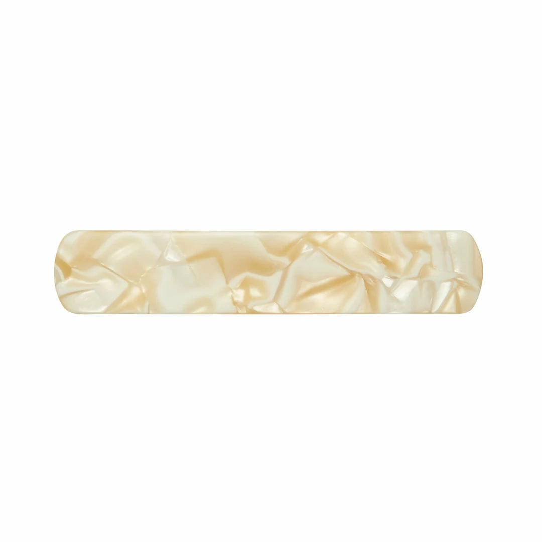 The model wears our (from top to bottom) No. 3 Heirloom Clip in Alabaster, Bizarre Checker, and Cognac.