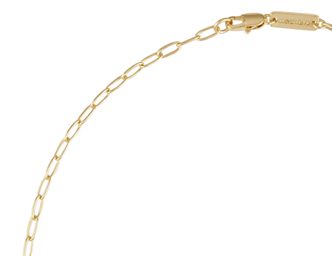 The model also wears our .75″ Perfect Hoops, Petite Oval Link Necklace, Petite Figaro Necklace, Oval Link Necklace, and 22″ Round Box Chain.