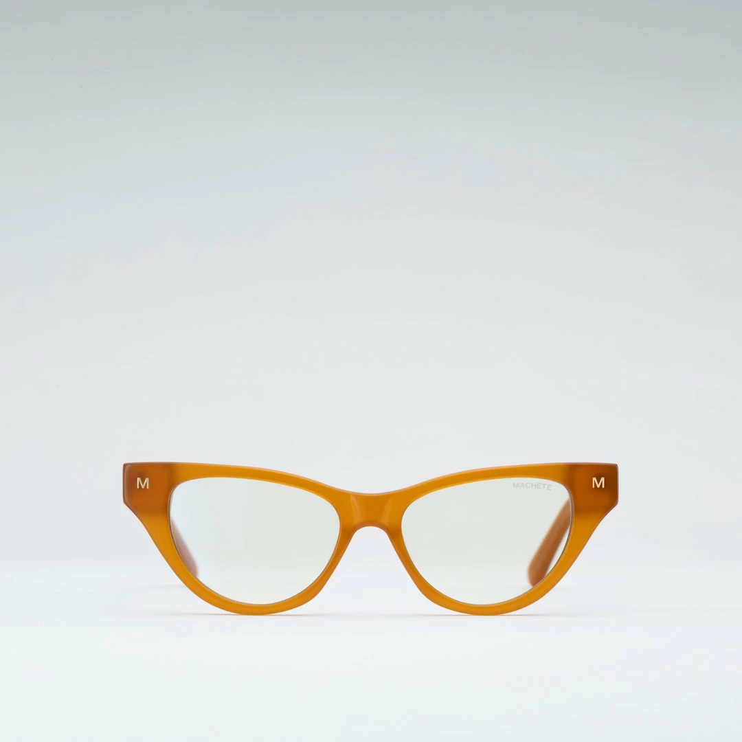 Take any ensemble to the next level with Suzy, our ultra-sleek narrow cat-eye frame. Handcrafted from the most environmentally friendly and highest-quality acetate on the market today to ensure your frames will not only last but be kind to the planet as well. Adorned with a gold Machete logo and hardware as well as a ring for your eyeglass chain at the temples.
