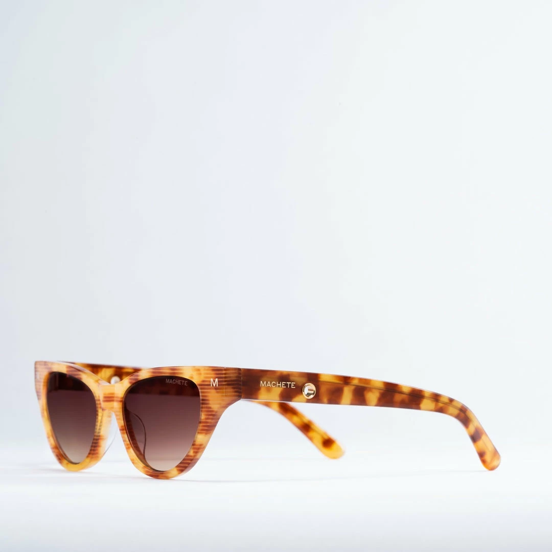 Take any ensemble to the next level with Suzy, our ultra-sleek narrow cat-eye frame. Handcrafted from the most environmentally friendly and highest-quality acetate on the market today to ensure your frames will not only last but be kind to the planet as well. Adorned with a gold Machete logo and hardware as well as a ring for your eyeglass chain at the temples.